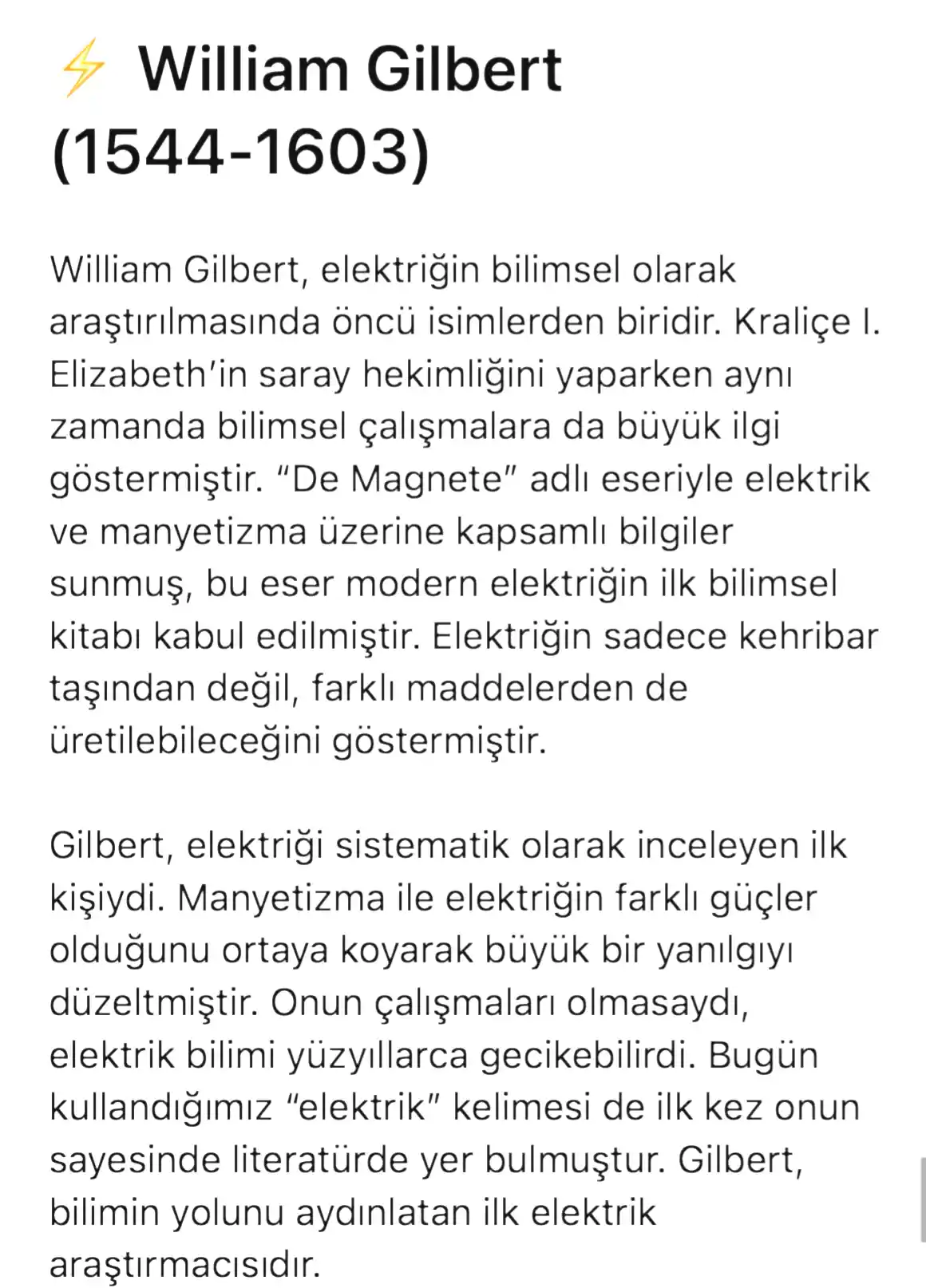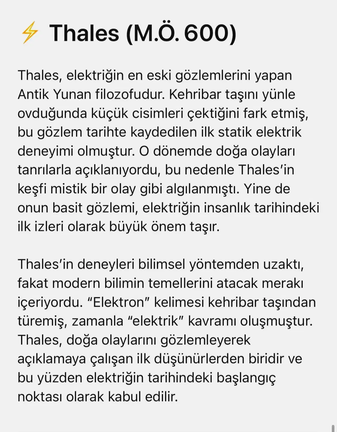 Elektriğin keşfi ve gelişimi tek bir bilim insanına değil, birçok farklı dönemde yaşayan bilim insanlarının katkılarına dayanır. İşte elektriğin keşfinde önemli rol oynayan başlıca bilim insanları: